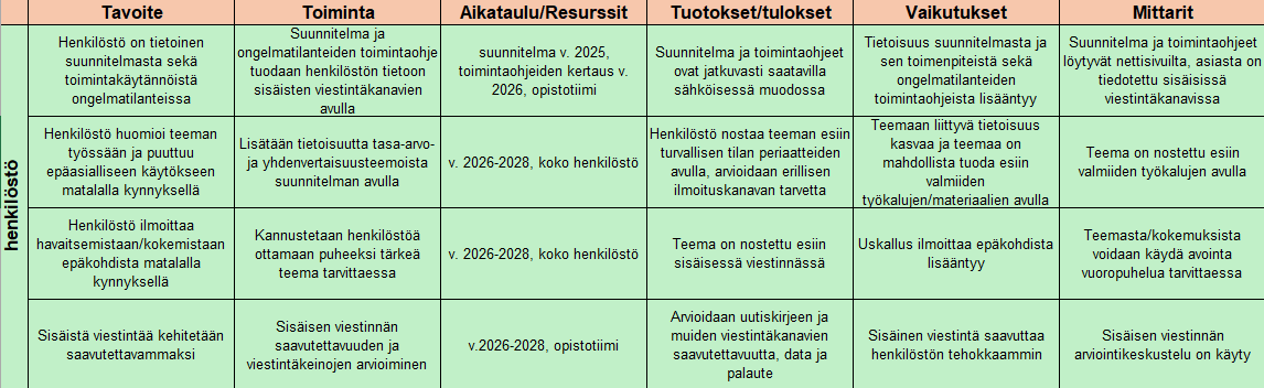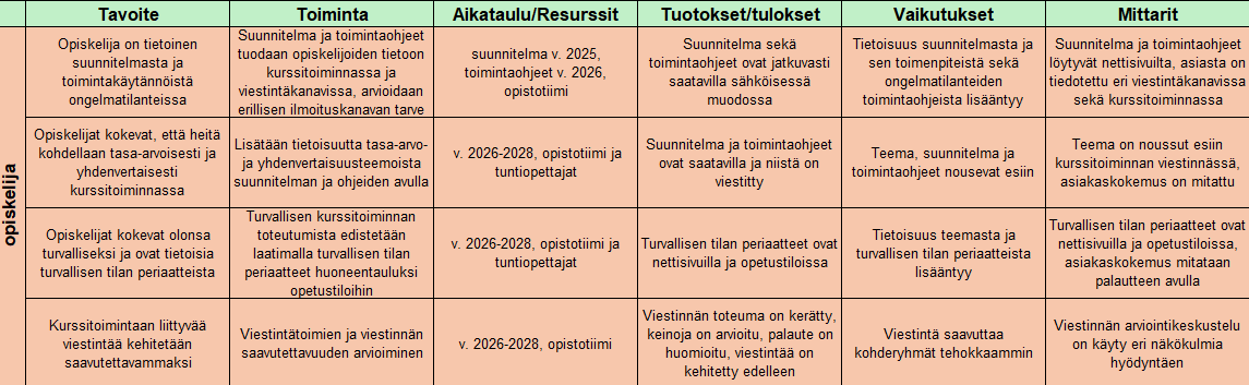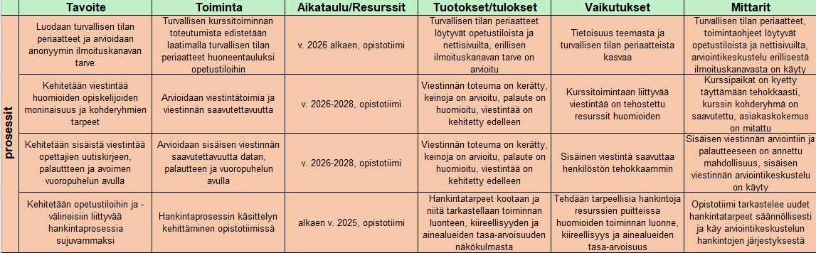 Näistä tavoitteista on johdettu yksityiskohtaisemmat osatavoitteet, konkreettiset toimenpiteet ja mittarit opiskelijoiden, henkilöstön ja prosessien osalta.