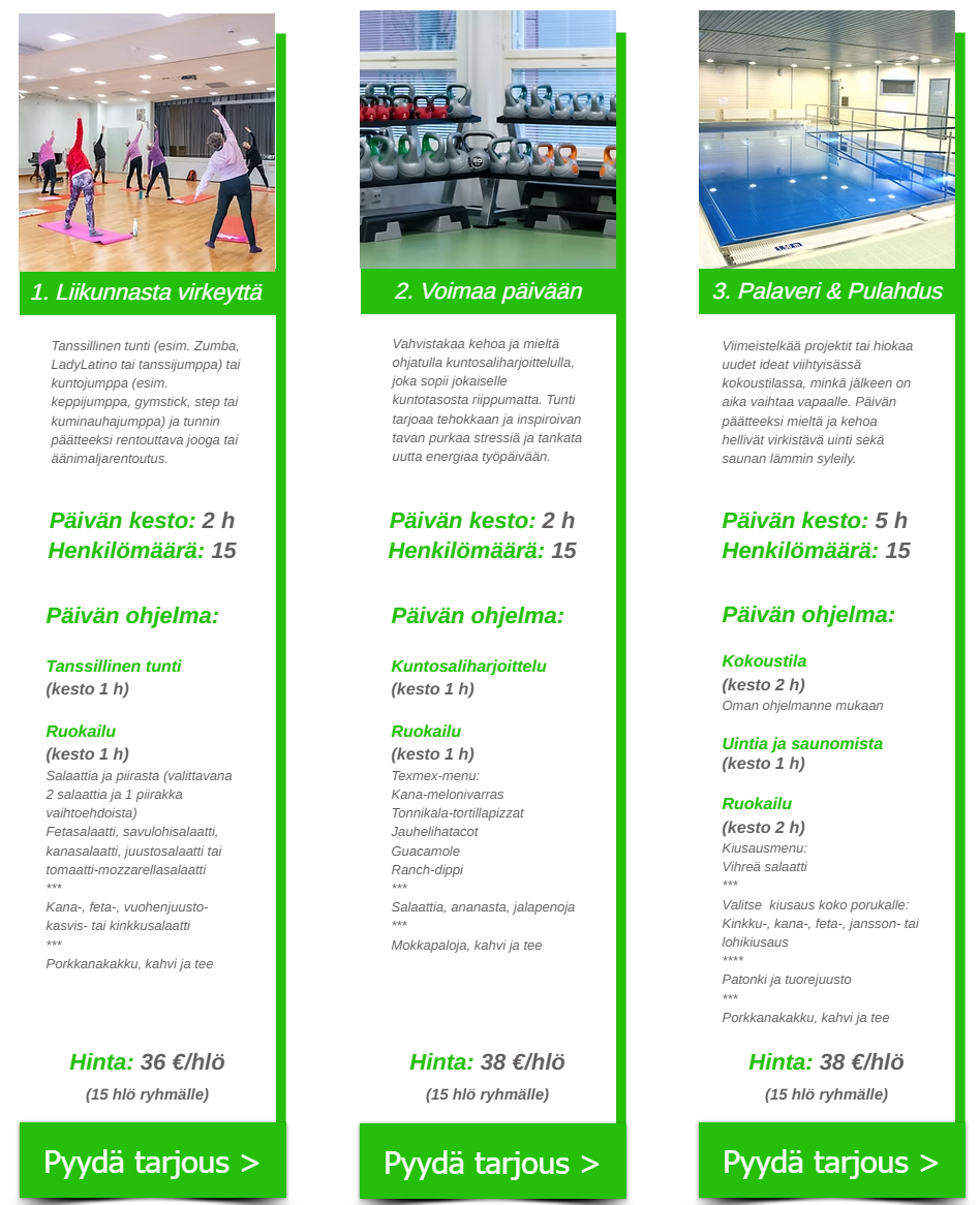Virkistyspäivä voidaan muodostaa toiveidenne mukaan tarjoamistamme liikuntaryhmistä. Halutessanne tunteja voidaan pitää yksi tai useampikin. Huom! Lajien saatavuus voi vaihdella. Meiltä löytyy myös virkistyspäivien paketteja.Tiloistamme löytyy parhaiten aikoja kansalaisopiston kauden ulkopuolelta viikoilta 17-25, 32-35, sekä 49-51. Kysy rohkeasti myös muita ajankohtia!