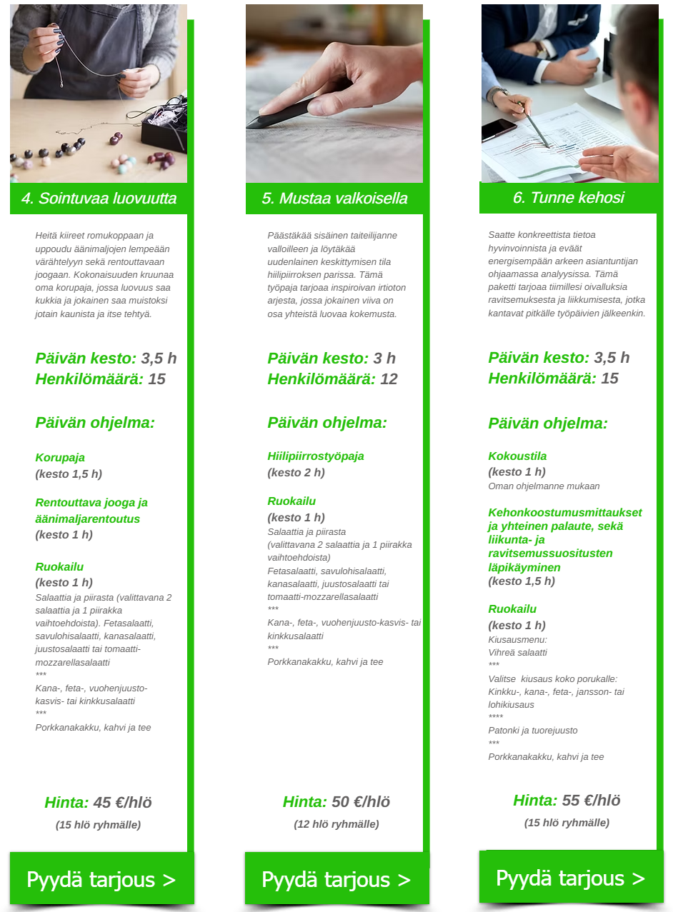 Pakettien hinnat on laskettu 15 henkilön ryhmälle (Mustaa valkoisella -paketti 12 henkilölle). Jätä toiveesi, jos haluatte valmiin paketin isommalle tai pienemmälle henkilömäärälle tai haluatte räätälöidä pakettia oman mielenne mukaiseksi.