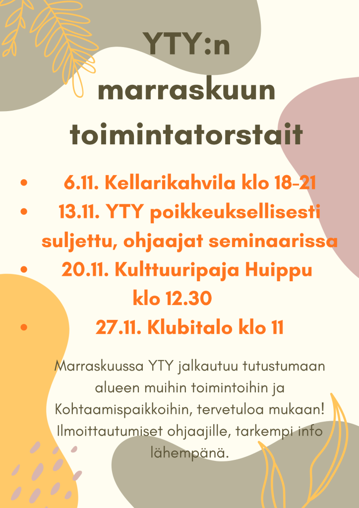 Torstaisin YTY:ssä on toimintapäivä, kts. marraskuun ohjelma. Toimintatorstaihin tulee ilmoittauttua etukäteen, viimeistään edeltävänä keskiviikkona klo 15 mennessä. Ilmoittautua voit laittamalla viestiä tai soittamalla ohjaaja Lindalle p. 041 730 6337 / linda.viljanen(a)harjulan.fi. tai ohjaaja Outille p. 044 5510 442 / outi.malinen(a)dila.fi.